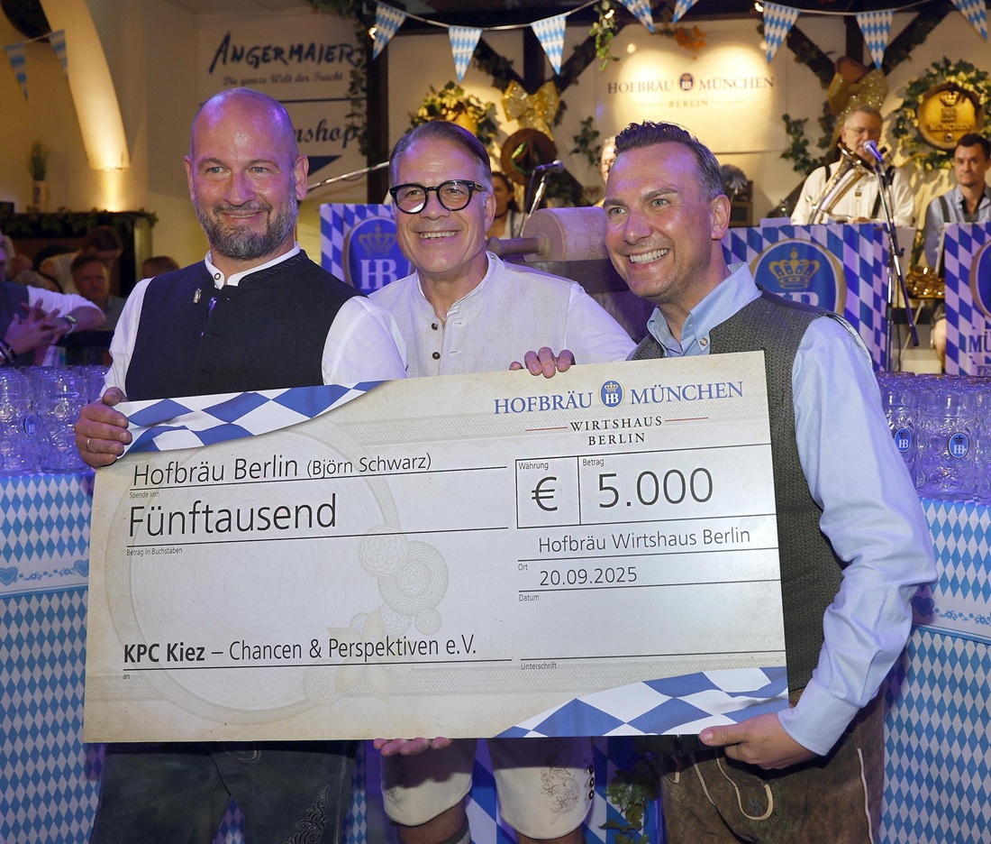 überreichte der Geschäftsführer des Hofbräu Berlin, Björn Schwarz dem Sternekoch einen Scheck in Höhe von 5000,00 Euro für