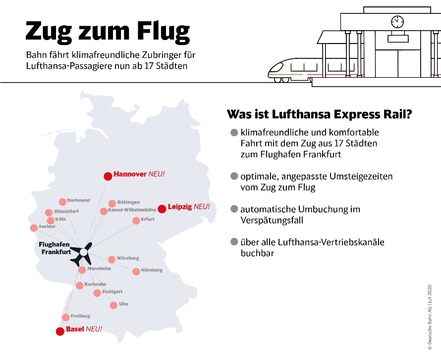 Kunden fahren mit ihrer Lufthansa-Bordkarte mit der DB zum Frankfurter Flughafen. Die neuen Strecken sind in allen Lufthansa-Vertriebskanälen buchbar. Das Netz der Lufthansa Express Rail-Verbindungen vom/bis Frankfurt Flughafen wächst mit Hannover, Leipzig und Basel auf 17 Städte. Insgesamt bieten Deutsche Bahn und Lufthansa ab 17 Bahnhöfen mit bis zu 123 Zug-/Flugnummern Zubringer auf der Schiene vom/zum größten deutschen Flughafen und LH-Drehkreuz Frankfurt an.
